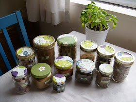 | Recycled artichoke, jam, olive, capers and honey jars, repurposed as spice jars. |